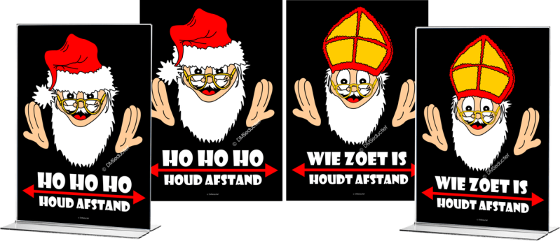Speciale poster over afstand houden in coronatijd. Poster met Sinterklaas die zegt: 'Wie zoet is, houdt afstand' en van de Kerstman dei zegt: 'Ho, Ho, Ho, houd afstand'. Positieve posters voor in de winkel, op school of op kantoor. De posters zijn los verkrijgbaar, of in een posterstandaard of wissellijst. De posters zijn aan twee kanten bedrukt en kunnen dus voor een raam of deur opgehangen worden. In een posterstandaard zet je de poster zo op een tafel, balie, toonbank of kast. De posters zijn verkrijgbaar in A3-formaat. Deze grappige 'Houd afstand' posters kopen.