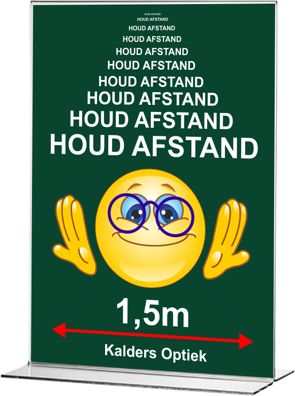 Bij Kalders optiek hangt bij de ingang een hele grote lijst (B1-formaat). Hierin hing al jaren dezelfde reclame poster. Deze poster viel natuurlijk niet meer op. Nu hangt er, bij de ingang, in dezelfde lijst een grappige, opvallende poster 'houd afstand'. Tegelijkertijd hebben we dezelfde afbeelding op A5 -formaat gemaakt en deze staan, in een ster-standaard , op de tafels in de winkel.